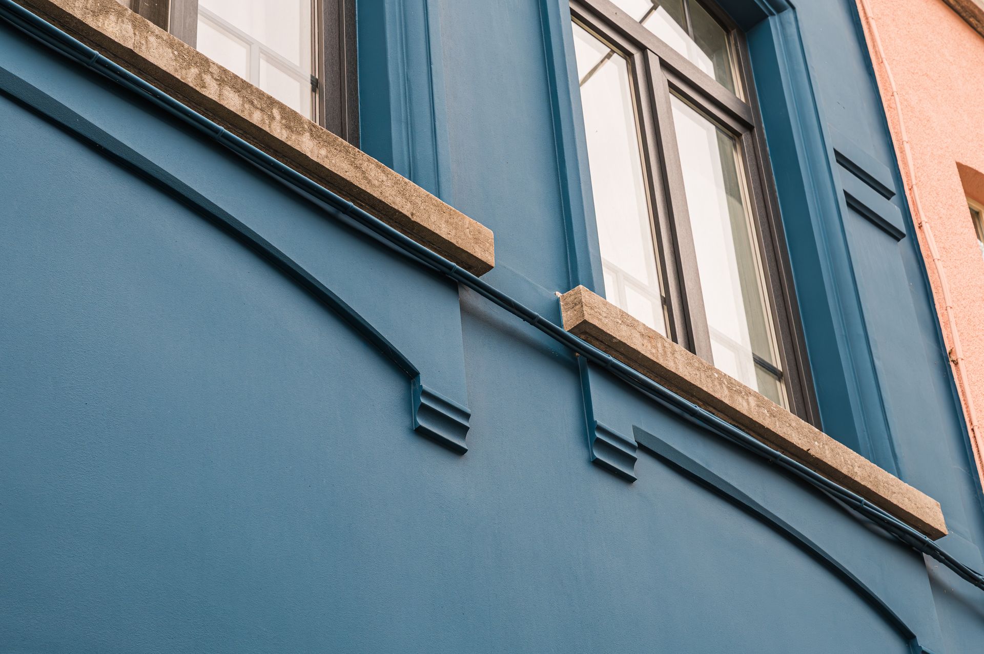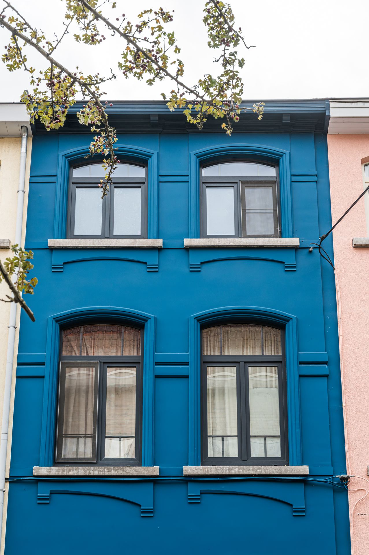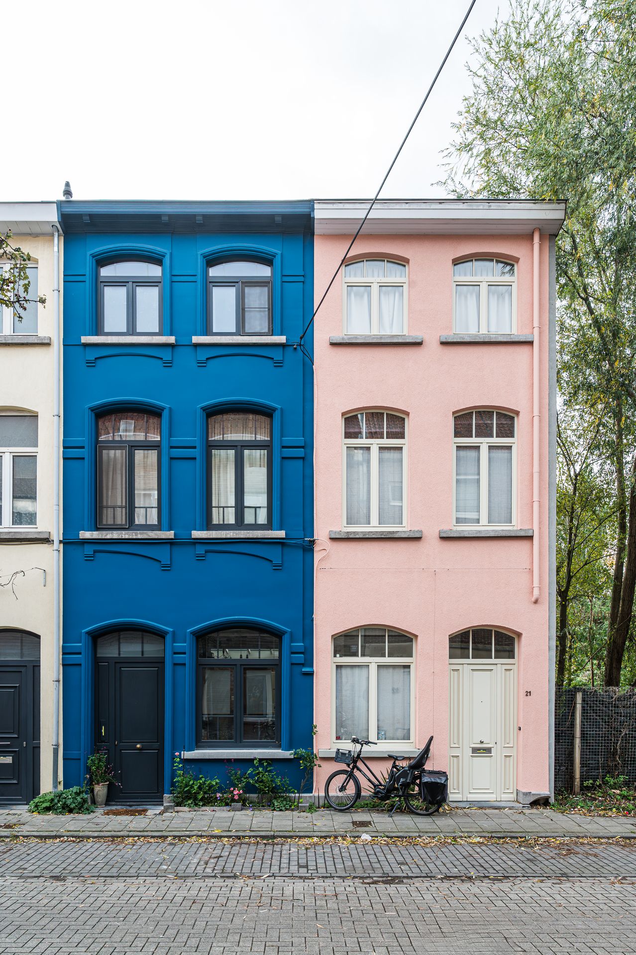 Enkele maanden later stonden er 3 gevels tegelijk in de steigers. Elke gevel vereiste een andere aanpak. De blauwe gevel was op voorhand in heel slechte staat, daar bouwden we alles opnieuw op vanop de baksteen. De witte gevel konden we netjes plamuren en schilderen. De roze gevel had enkel een laag verf nodig.