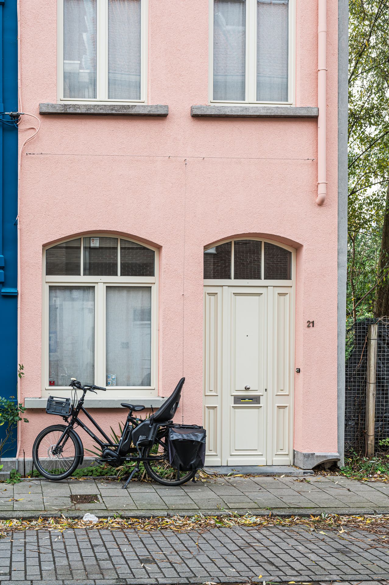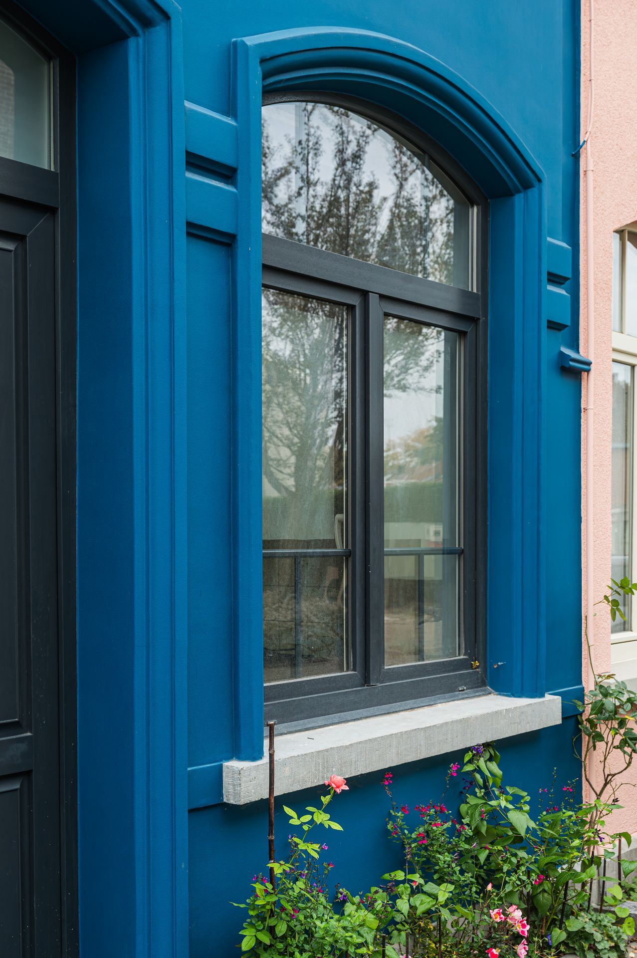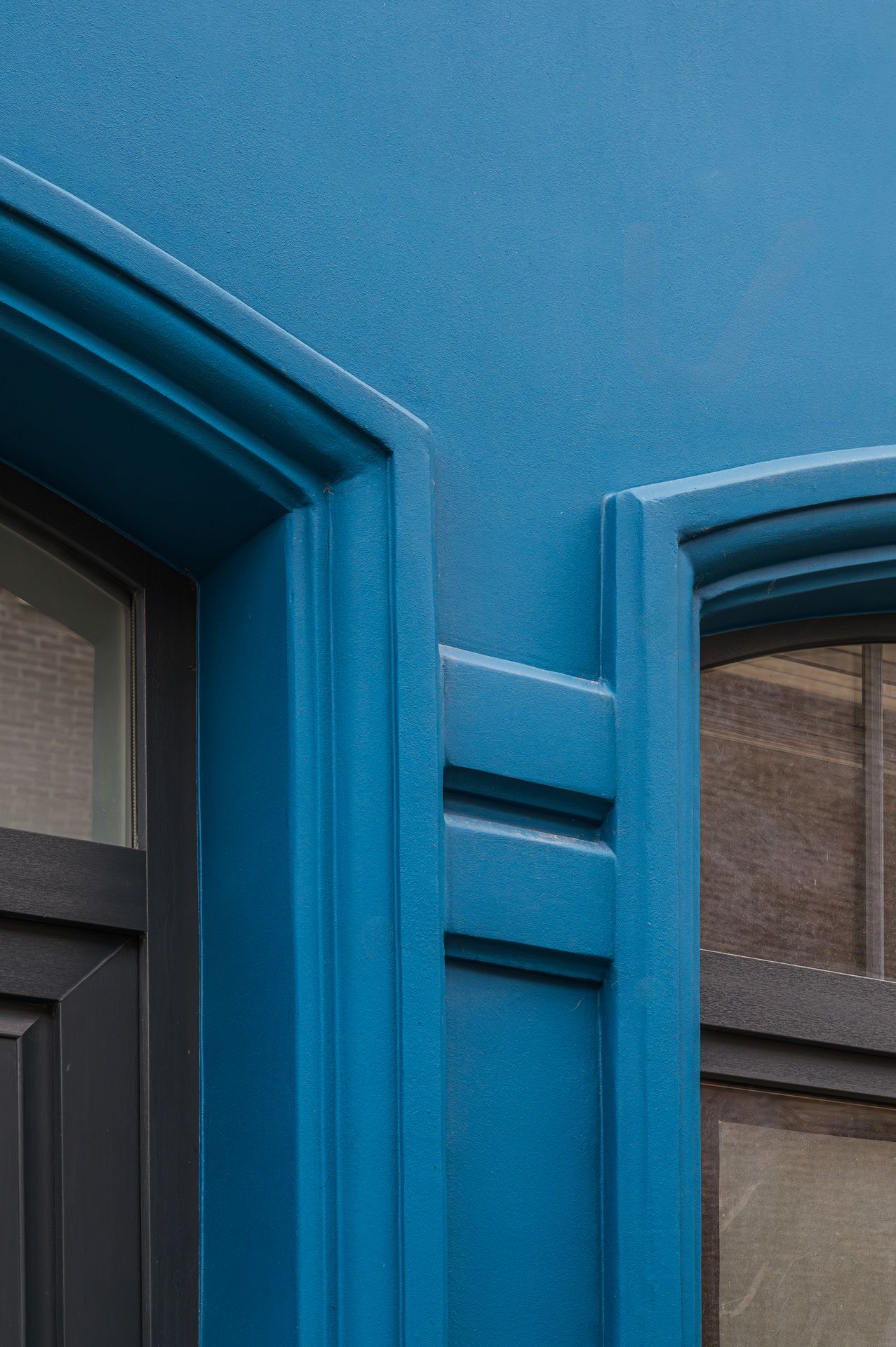 Enkele maanden later stonden er 3 gevels tegelijk in de steigers. Elke gevel vereiste een andere aanpak. De blauwe gevel was op voorhand in heel slechte staat, daar bouwden we alles opnieuw op vanop de baksteen. De witte gevel konden we netjes plamuren en schilderen. De roze gevel had enkel een laag verf nodig.